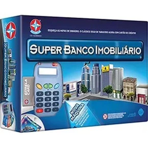 O Super Banco Imobiliário é o mais moderno jogo de compra e venda de propriedades! Todas as transações agora serão feitas pelo cartão de crédito e as ações das companhias do jogo são reais! O mercado está se modernizando e você não pode ficar para trás! Com a máquina de cartão de crédito, as companhias reais no tabuleiro e as propriedades atualizadas você vai jogar como se estivesse negociando de verdade! Este novo jogo traz todo o dinamismo do mundo dos negócios para a sua casa, você pode unir família e os amigos para jogar. Esta é sua oportunidade de tornar-se um grande milionário!