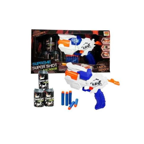 Brinque Sozinho ou Com Os Amigos, As Crianças Adoram O Lançador Super Shot Supreme. Acompanha 1 LANÇADOR, 06 DARDOS E 3 COPOS PARA ALVO Aproximadamente 27 cm de Comprimento. Insira os dardos, puxe a alça de carregamento e aperte o gatilho. Diversão garantida. Idade Recomendada: Acima de 6 Anos. Marca: DM Toys. Selo INMETRO.