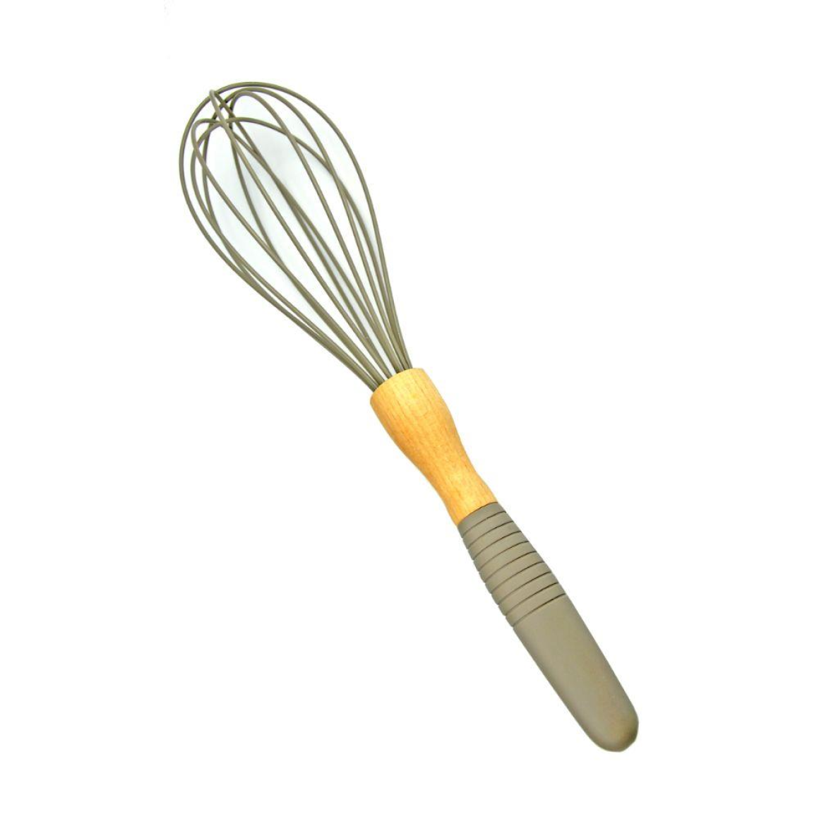 Batedor de claras de silicone com cabo de madeira e silicone.