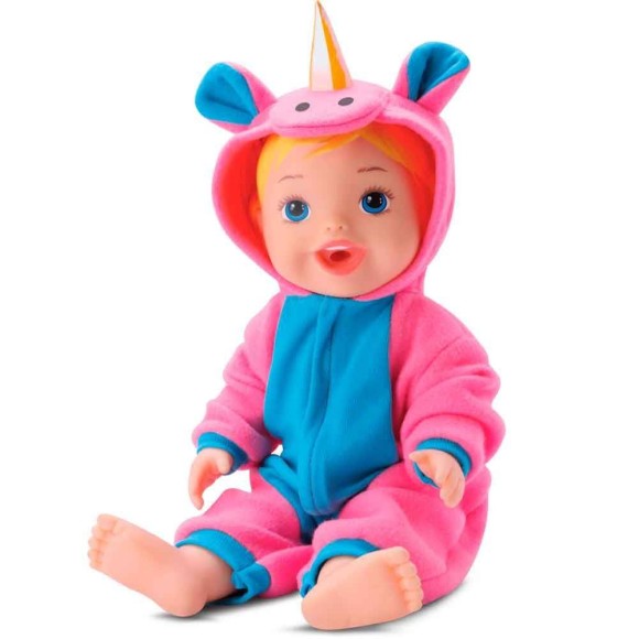 Vem com pijama de unicórnio, escova e pasta de dentes, mamadeira e fraldinha