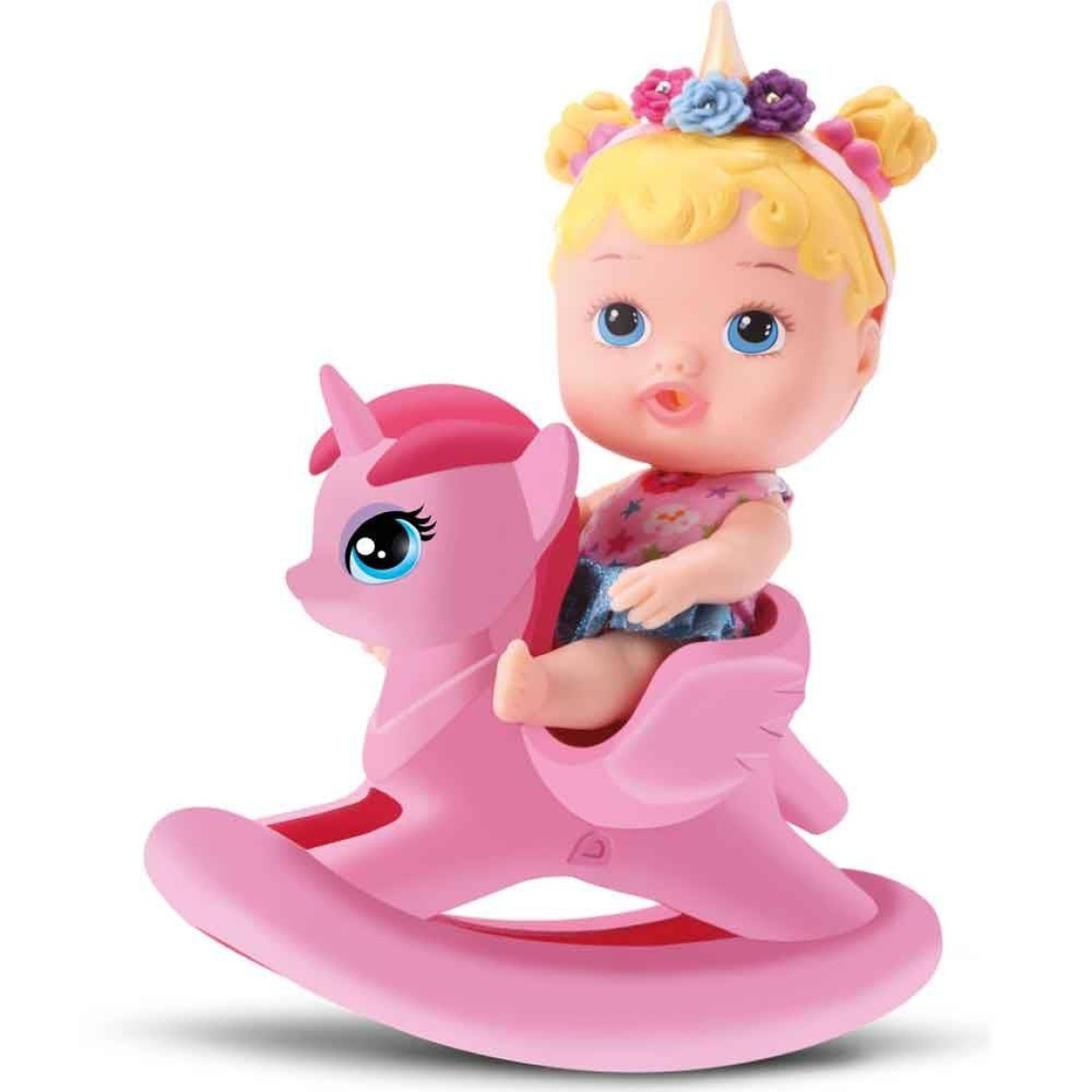 Uma bonequinha super fofa que adora balançar no seu unicórnio! Acompanha uma linda tiara de unicórnio.
