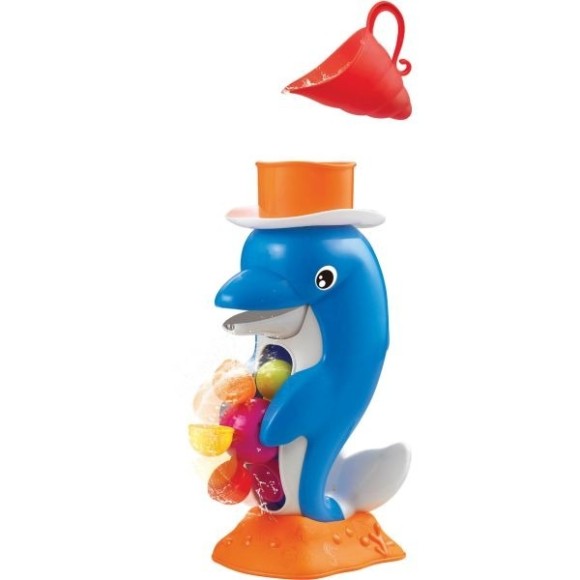 É só colocar água no chapéu do Golfinho que a água despejada irá escorrer e sairá pela sua boca, logo após ela cairá sobre o moinho d'água em sua barriga fazendo-o girar.
