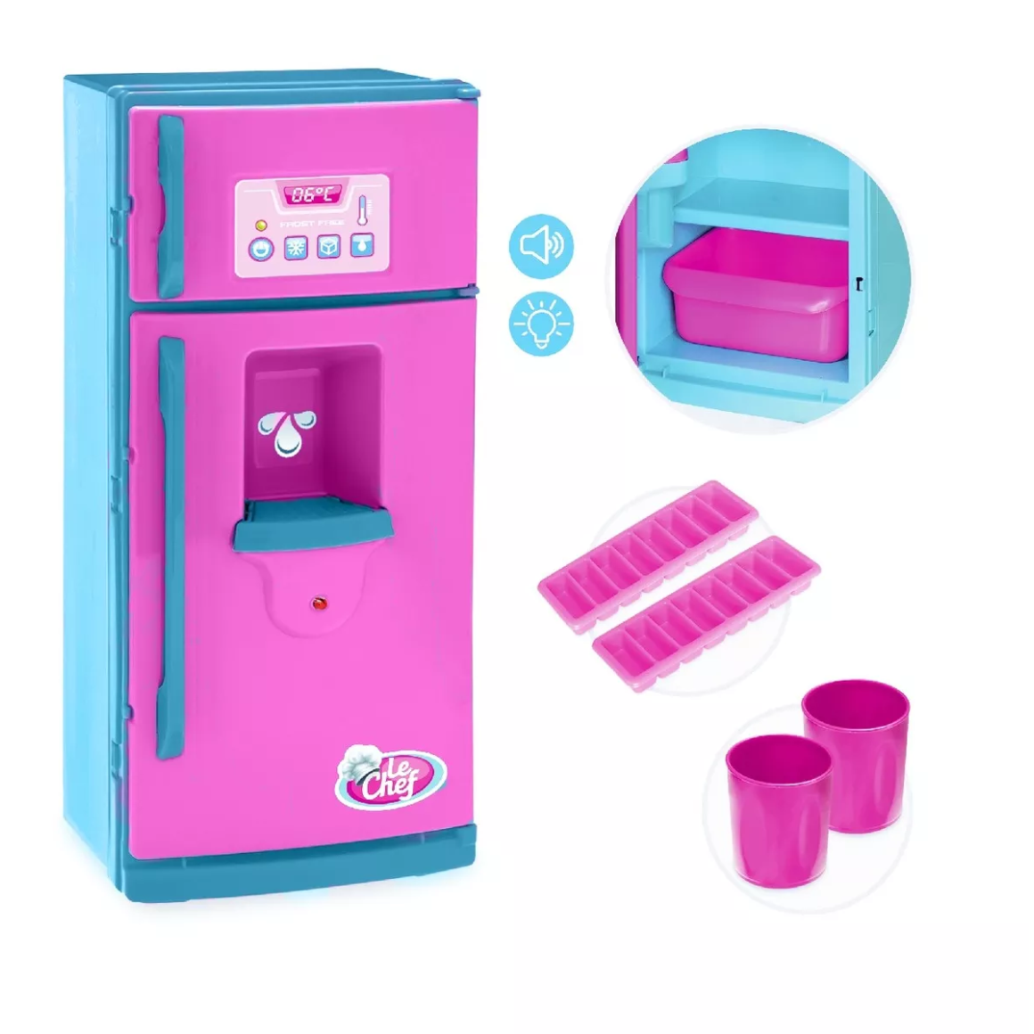 Ela tem vários compartimentos. freezer e gaveta móvel. Com mecanismo de som e luz, dispenser na porta e com acessórios para brincar!