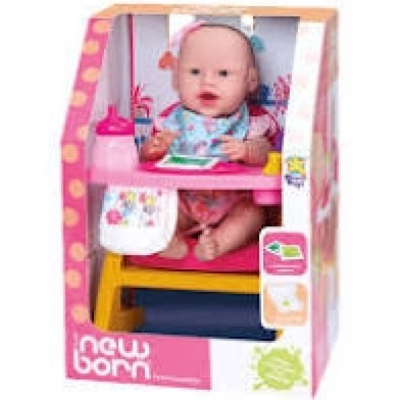 Boneca mede aproximadamente 25cm de altura. Boneca em cima do cadeirão mede aproximadamente 36cm