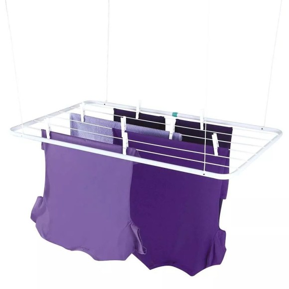 Varal de Teto é a solução perfeita para quem não dispõe de muito espaço para secar as suas roupas. Muito bem planejado, acompanha um kit para que você possa fixá-lo no teto e corda para que a altura possa ser regulada de acordo com sua necessidade. Possui estrutura em tubo de aço com acabamento em pintura epóxi a pó branca e peças plásticas em polipropileno. Tem capacidade para 6,99 metros ou 13 Kg de roupas úmidas distribuídas uniformemente. Extremamente resistente, é indicado principalmente para regiões litorâneas. Leve e durável, possui qualidade nos acabamentos, garantia dos produtos MOR